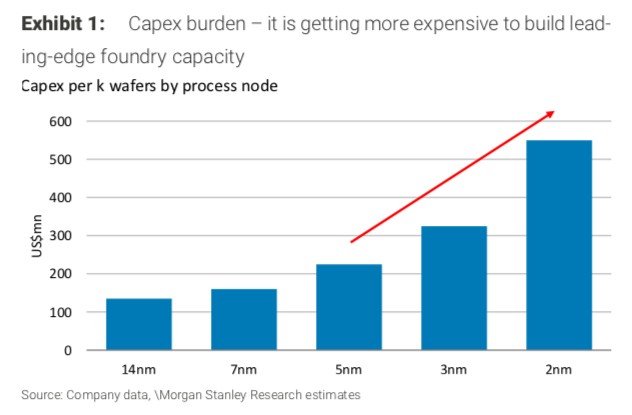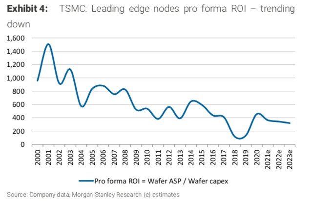 然而摩根士丹利報告指出,雖然過去一段時間以來,台積電確實憑藉商業化 “摩爾定律” 取得市盈率長期擴張,但5納米制程以後,2、3納米制程上需要更高強度的資本支撐(Exhibit 1),可能導致先進製程晶圓代工的投資回報率(ROI)出現結構性下滑(Exhibit 4)。