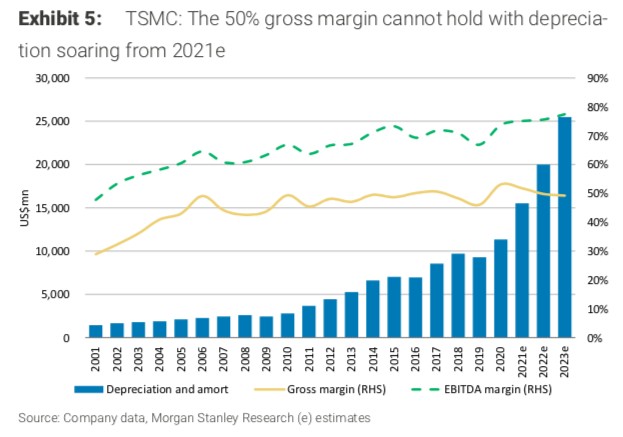 摩根士丹利預計,以上種種將削減台積電2021年毛利率至50%以下,跌破投資者重要心理關口,也低於華爾街對其此後兩年 52% 毛利率的共識。而這還是在預設芯片業處於上行週期的情況下,一旦產業進入下行週期,投資者可能不得不重估台積電長期營運成長預期。