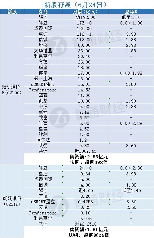 智通財經 APP 獲悉,歸創通橋-B(02190)、朝聚眼科 (02219) 正在招股中。截至 6 月 24 日,富途、輝立、耀才等合計分別為其借出近 1007.45 億港元及近 46.6516 億港元;其中,歸創通橋-B、朝聚眼科分別超購 392 倍、逾 24 倍。