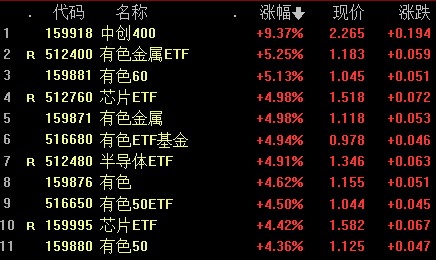主要行業 ETF 漲跌不一,有色金屬 ETF 漲超 5%,芯片 ETF 漲近 5%。