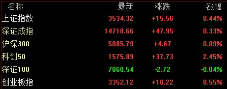 截止收盤滬指漲 0.44%,深成指漲 0.33%,創業板指漲 0.55%。