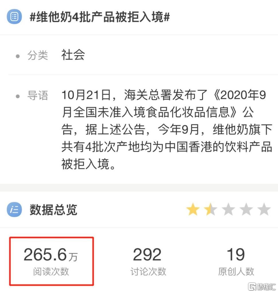 根據海關總署發佈的信息,2020 年,維他奶旗下共有 11 批次產地均為中國香港的飲料產品被拒入境。原因是標籤不合格和超範圍使用營養強化劑泛酸鈣”。