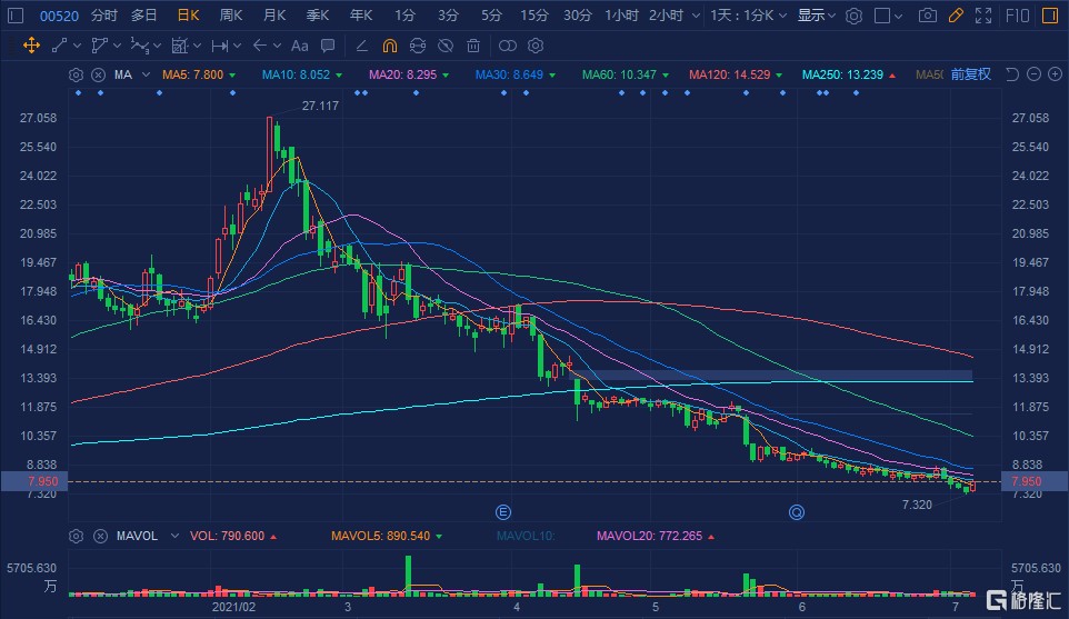 呷哺呷哺反彈拉昇漲至 7%,報 7.95 港元,暫成交 6164 萬港元,總市值 86 億港元。該股自 2 月高位以來持續下跌,截至昨日創下 7.32 港元的調整新低,區間累計跌幅達 72%。近年來湊湊餐飲為呷哺呷哺主要的增長動力,近期高層的頻繁變動,令人關注擴張步伐。瑞銀報告稱,首次給予呷哺呷哺買入評級,之前的下跌主要由於市場關注管理層變動,認為投資者屬過分憂慮。該行稱,今年公司旗下高端品牌湊湊火鍋擬按計劃在今年淨增 70 家分店,估計分店數量至 2023 年將大幅增加至 480 家,未來三年的擴充可帶動盈利持續增長,預期 2021 至 2023 年每股盈利複合增長約 33%。
