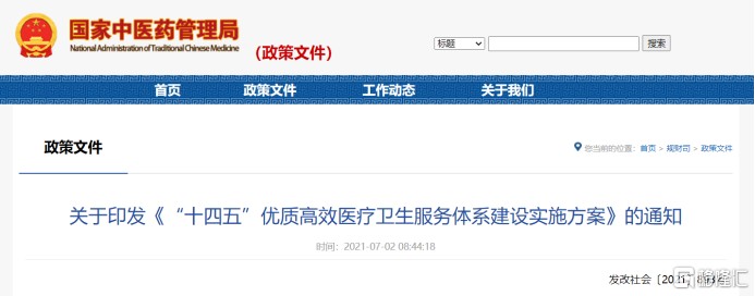 7 月 1 日,四部委印發《“十四五” 優質高效醫療衞生服務體系建設實施方案》(下稱方案),提出到 2025 年基本建成優質高效整合型醫療衞生服務體系,推動中醫藥和西醫藥相互補充、協調發展,建設 30 個左右國家中醫藥傳承創新中心。