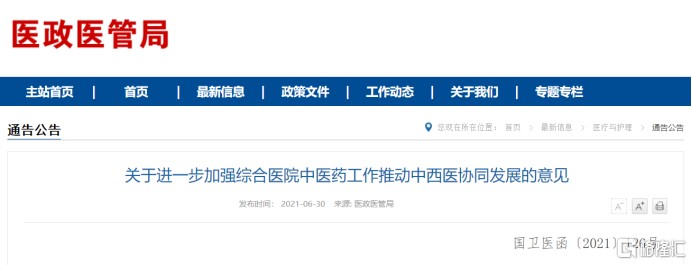 6 月 30 日,據國家衞健委網站消息,國家衞生健康委、國家中醫藥局、中央軍委後勤保障部衞生局聯合發佈了《關於進一步加強綜合醫院中醫藥工作推動中西醫協同發展的意見》(下稱意見)。