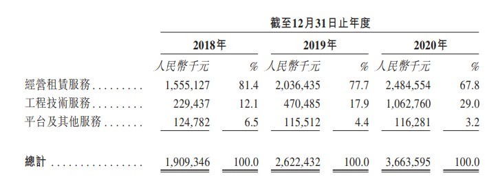 於往績記錄期間,公司的大部份收入來自經營租賃服務。近三年來,該項服務產生的收入分別為 15.55 億元、20.36 億元、24.85 億元,分別佔相應年度收入的 81.4%、77.7% 及 67.8%。來自工程技術服務及平台及其他服務的收入合併佔總收入的百分比由 2018 年的 18.6% 增至 2020 年的 32.2%。