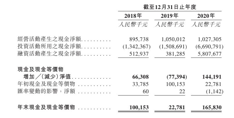 目前公司主要資金來源包括業務運營所得現金及借款。2018 年至 2020 年,公司經營活動產生的現金流分別為 8.96 億元、10.50 億元、10.27 億元,逐年遞增。