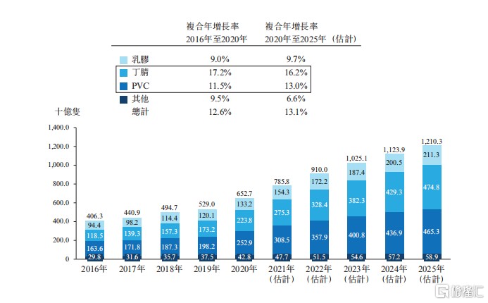 泰能醫療招股説明書顯示,2020 年全球的一次性手套市場規模約 192 億美元,摺合人民幣約 1250 億元,同比增長約 105 億美元,摺合人民幣約 682 億元。不僅如此,在後疫情時代一次性手套的用户黏性作用下,市場規模並沒有縮小而是會持續擴大,預計 2025 年市場規模達 224 億美元,摺合人民幣約 1453 億元。在一次性手套中佔據半壁江山的丁腈手套,預計未來 5 年的年複合增長率更是將達到 3.8%,2025 年其市場規模高達 116 億美元,摺合人民幣約 755 億元。
