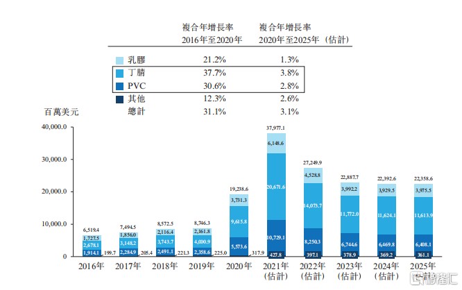 據弗若斯特沙利文報告,2020 年全球的一次性手套銷售量 6527 億隻,相較於 2019 年的 5290 億隻增長了 1237 億隻,而這些增量主要是由丁腈手套和 PVC 手套同比增加 1053 億隻貢獻的。不但如此,作為 2020 年銷售量增量的主力軍丁腈手套,預計未來 5 年的年複合增長率達到 16.2%,全球銷售量在 2025 年將達到 4748 億隻。