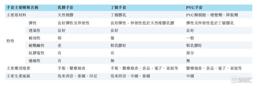 一次性手套主要包括乳膠手套、丁腈手套和 PVC 手套,其中,丁腈手套具備眾多優異的特性:彈性、透氣性、抗靜電性不輸於天然乳膠手套,耐油性、耐酸鹼性優於乳膠手套,彈性、耐油性、抗靜電性優於 PVC 手套,不含會引起過敏的乳膠蛋白,是一次性手套中的高端產品。
