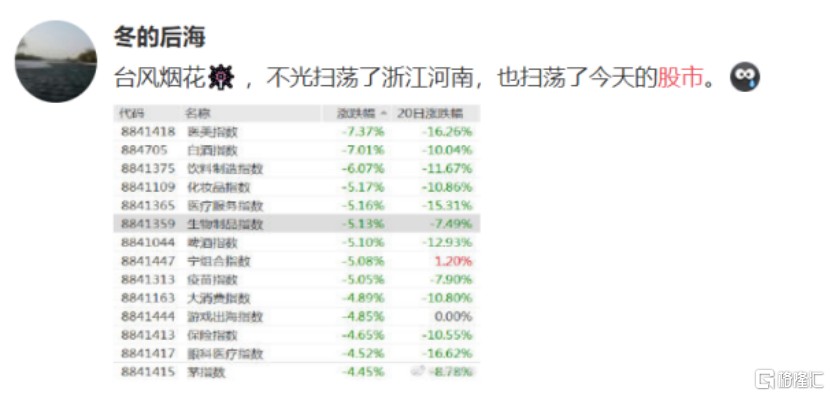 看來,這幾天四處肆虐的颱風煙花不光掃蕩了浙江河南,也掃蕩了今天的股市,讓無數股民心如刀割,眼含淚花。