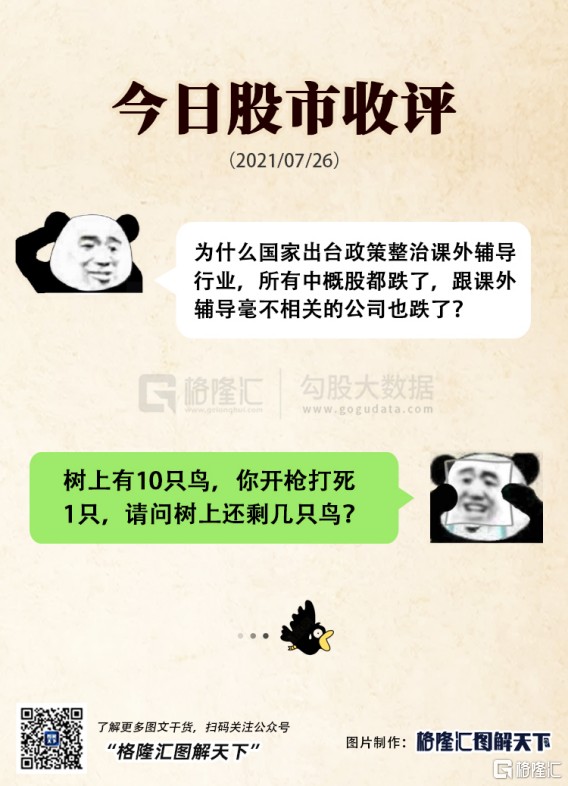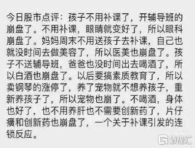 萬萬沒想到,今天股市大跌的原因,竟然是因為孩子不用補課!——因為孩子不用補課了,開輔導部的崩盤了,眼睛不容易近視了,眼科崩了,爸媽不用送孩子去輔導班補課了,就沒時間藉機會出去做美容和喝酒了,不喝酒,肝病癌症也不發了,片仔癀和創新藥也不用吃了。