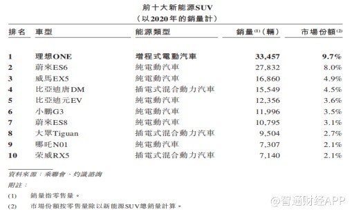 放眼整個新能源汽車市場,SUV 是一條熱門賽道。根據理想 ONE 於 2020 年銷售 33,457 輛 SUV,在新能源 SUV 市場市佔率 9.7% 計算,2020 年中國新能源 SUV 銷量約為 34.5 萬輛。灼識諮詢報告,2020 年中國新能源汽車市場規模為 120 萬輛,這意味着新能源 SUV 的市場份額為 28.7%。據智通財經 APP 統計,2020 年,中國前十大新能源 SUV 車型銷量為 15.31 萬輛,佔 SUV 細分市場的份額的 44.39%。