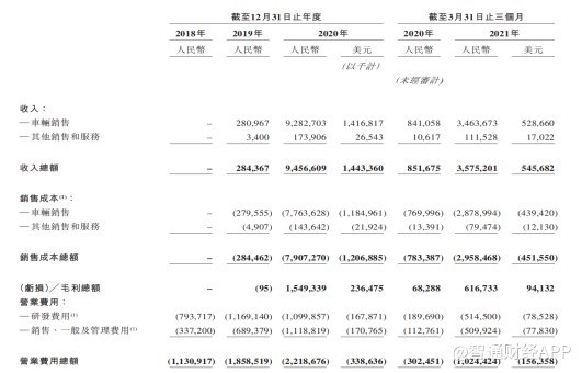 智通財經 APP 注意到,2020 年是理想營收爆發式增長的一年,當年實現營收 94.57 億元(人民幣,下同),但由於銷售成本總額和營業費用總額累計過百億,公司在 2020 年實現淨虧損約 1.52 億元。2021 年一季度,理想總收入繼續大幅增長至 35.75 億元,但即便如此公司單季度淨虧損還是達到 3.6 億元。