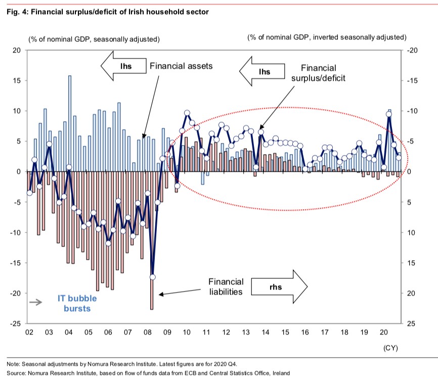 以西班牙為例,家庭在泡沫期間承擔了鉅額債務,並在泡沫破裂後開始償還債務(零軸以上紅條)並重築儲蓄。2008 年以後,圖表中帶小圓圈的線處於零軸上方,表示私營部門處於淨儲蓄狀態。