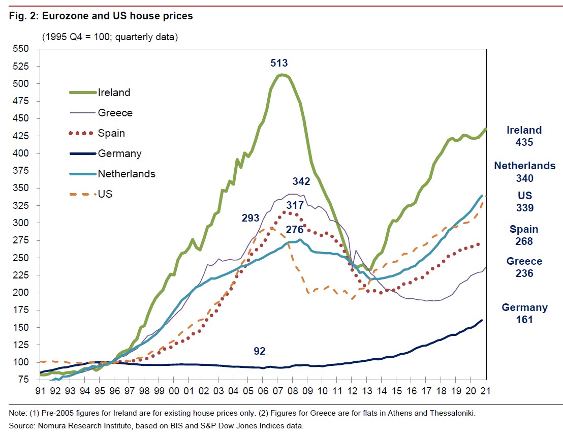 房價泡沫也在加速顯現,如下圖所示,愛爾蘭、荷蘭、美國等地房價均快速上行。辜朝明表示,這一方面將加劇貧富差距問題,另一方面,如果泡沫破裂,歐元區可能再次陷入 2008 年的資產負債表衰退,破壞金融體系穩定性。