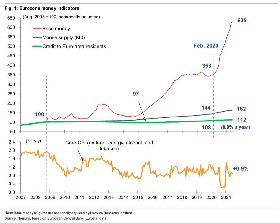 於是,歐元區貸款在2008年8月到2021年5月期間實際只增長了12%,年化增長率僅0.9%,這顯然不足以促進通脹。