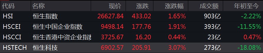 香港恒生指數開盤跌 0.13%,恒生科技指數跌 0.76%,騰訊控股、阿里巴巴、美團均低開。開盤後不久,熱門股票快速拉昇,重要指數悉數翻紅,截至發稿,恒生指數漲 1.65%,恒生中國企業指數漲 1.91%,恒生科技指數漲 3%。