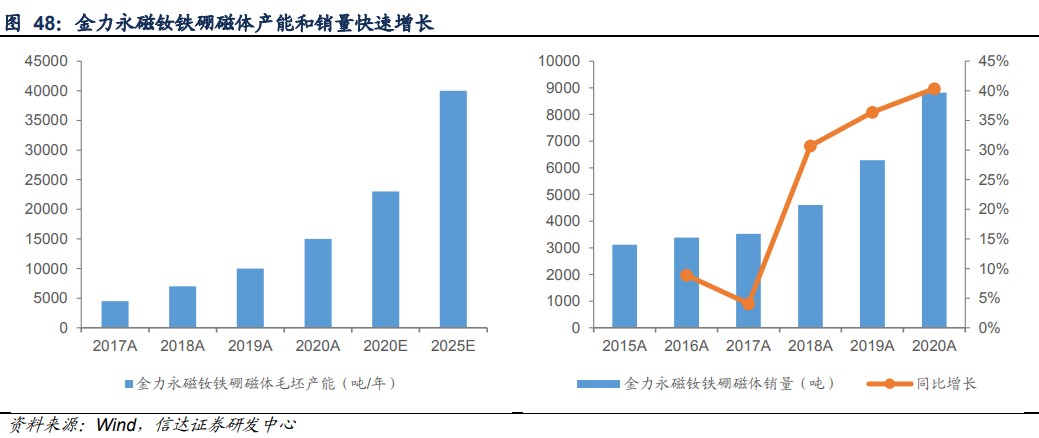 此前,信達證券研究員預計 2021-2025 年全球新能源汽車銷量將提升至 1500 萬輛以上,年複合增長率超過 35%;對釹鐵硼的需求量將達到 56000 噸以上,國內的需求量將達到 24000 噸左右,成為釹鐵硼永磁體最重要的消費領域。