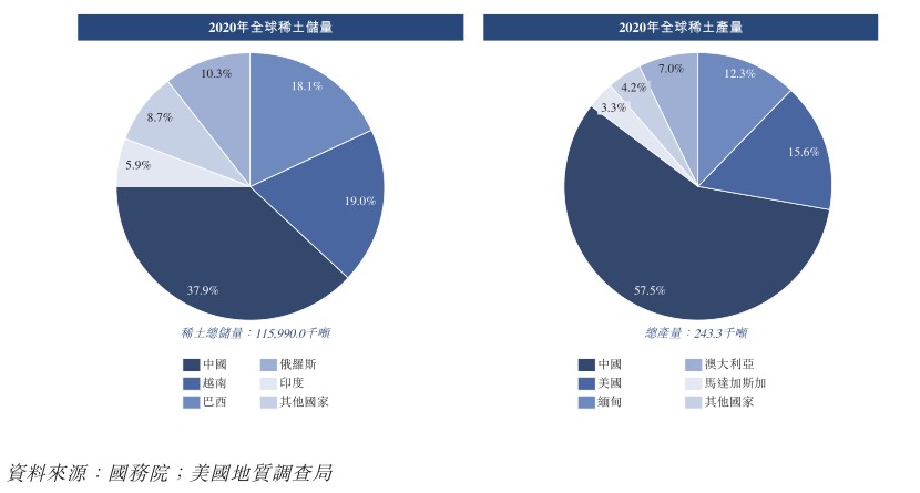 2020 年,全球稀土產量達 24.33 萬噸,中國稀土產量約佔全球的 57.5%。