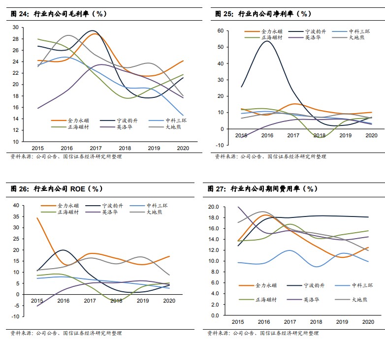 其他財務指標方面,金力永磁 2020 年的 ROE 高達 17.1%。與同行相比,金力永磁的毛利率、淨利率、ROE 等關鍵盈利指標均處於頭部位置。
