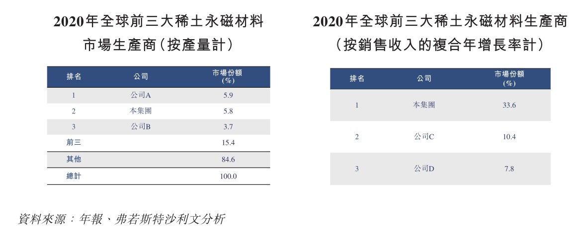 2020 年,按照稀土永磁的產量計,金力永磁排全球第二,市佔率相比第一名中科三環僅低 0.1%,遠超行業第三;