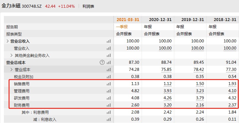 從利潤角度,金力永磁的毛利率 2018-2020 年分別為 22.2%、21.1% 和 23.7%,2020 年毛利率略有提升。2021 年第一季度,這一數據進一步增長至 25.3%。