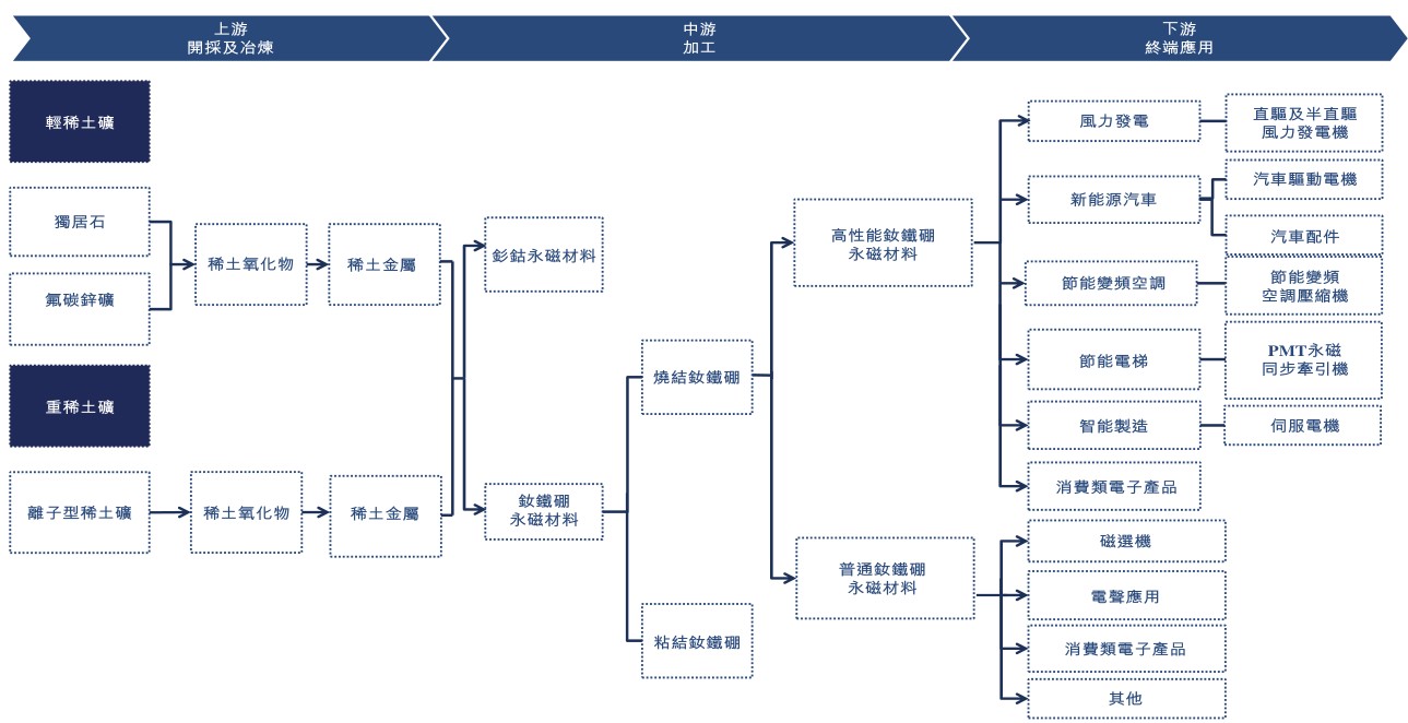 稀土產業鏈包括上游開採冶煉、中游精深加工、下游終端應用三大環節,公司燒結釹鐵硼永磁產品處於稀土中游深加工環節,主要利用其磁特性,製備各種具釹鐵硼有特殊功能器件,完成目標任務的應用技術。