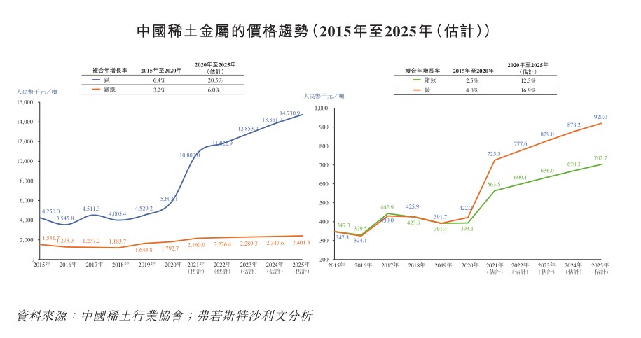 2015-2020 年,全球稀土永磁材料產量由約 14.99 億噸增至 2020 年的 21.74 億噸,複合增速約為 7.7%。預計這以市場到 2025 年有望達到 31.02 億噸,未來 5 年的複合增速預計降維 7.4%。