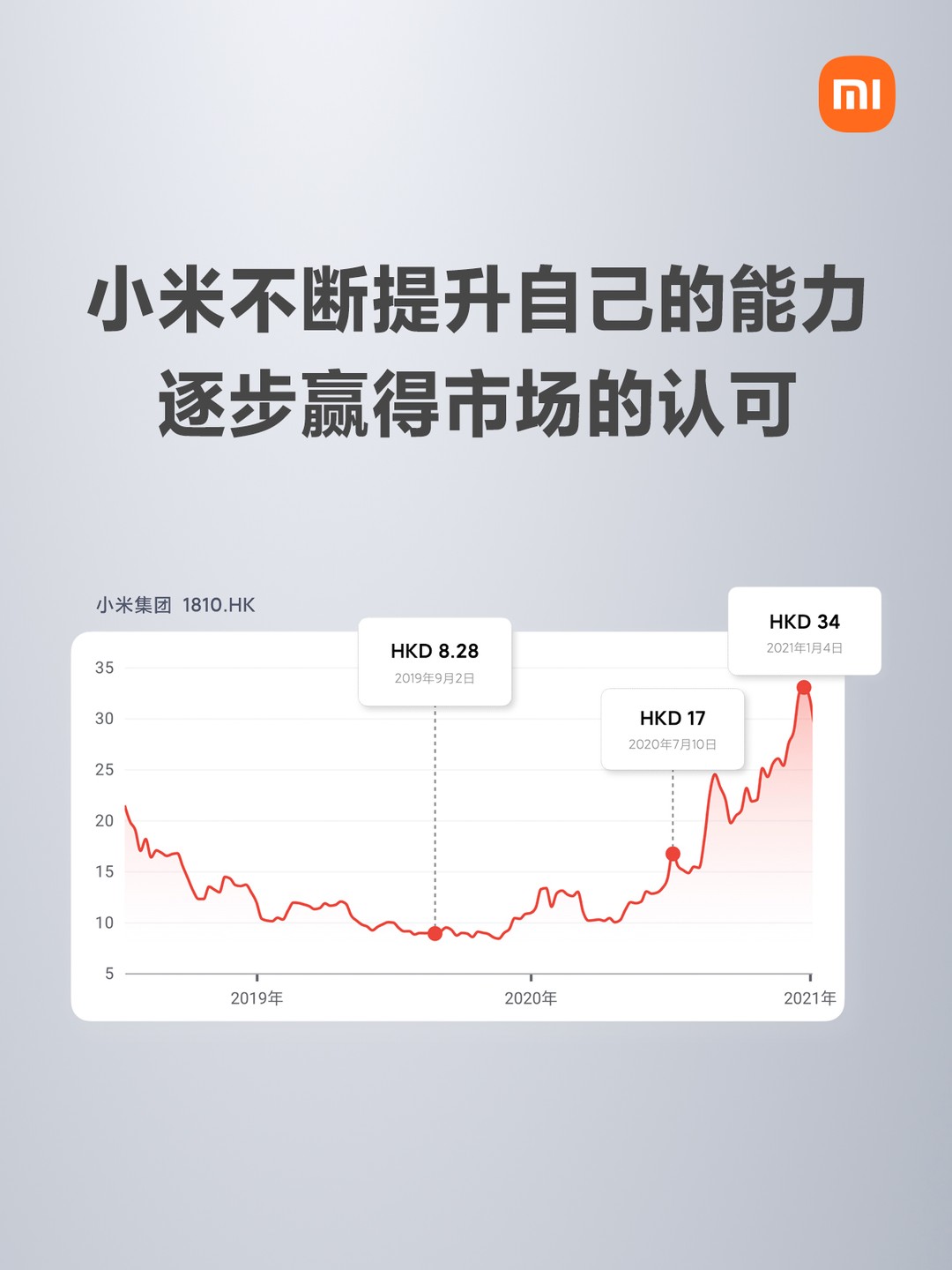上市两周年后,小米股价回到了 17 港元;2021年1月4日,终于达到了 34 港元。