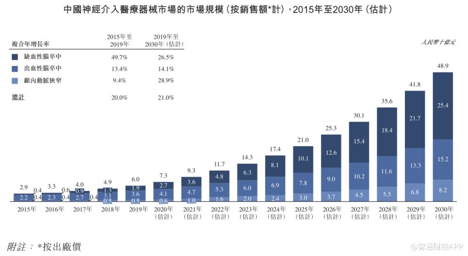 2015-2019 年,我國神經介入醫療器械市場規模由 29 億元增至 60 億元人民幣,複合年增長率達 20.0%。而據灼識諮詢預計,2019-2030 年,市場規模將進一步以 21.0% 的複合年增長率增長,並將於 2030 年進一步增加至人民幣 489 億元,可達近五百億行業規模,具備龐大市場需求。