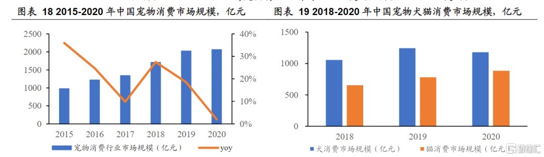 目前,國內寵物市場的規模,近 10 年年均複合增速達 21.5%,2020 年市場規模達 700 億元,同比增長 75%。對標成熟市場,中國寵物食品空間預計在 4000 億元左右,而中國寵物食品目前滲透率僅為 15%