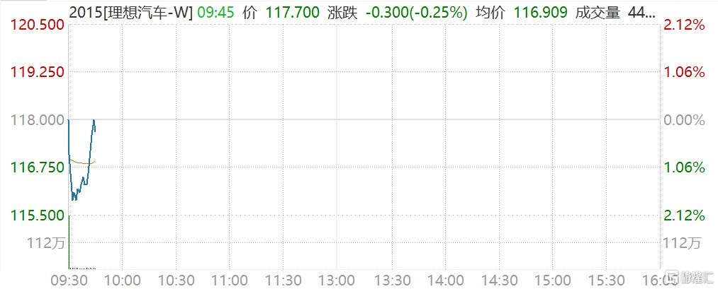 理想汽車今日首日上市盤中破發,一度跌 2.12% 報 115.5 港元,暫成交近 3 億港元,市值一度跌至 2370 億港元。該股發行價為 118 港元/股,募資約 115.5 億港元。隔夜美股理想汽車收漲 1.09% 報 30.72 美元,折算成港股市場價格為 120.15 港元。
