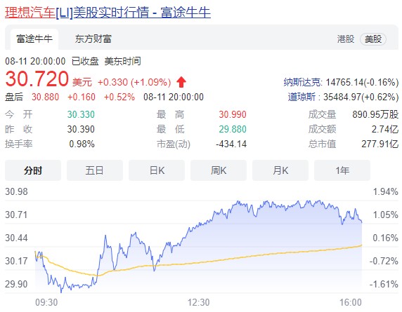 而反觀美股,截至美東時間 8 月 11 日收盤,理想汽車的美股收盤價 30.72 美元,約合 238 港元。