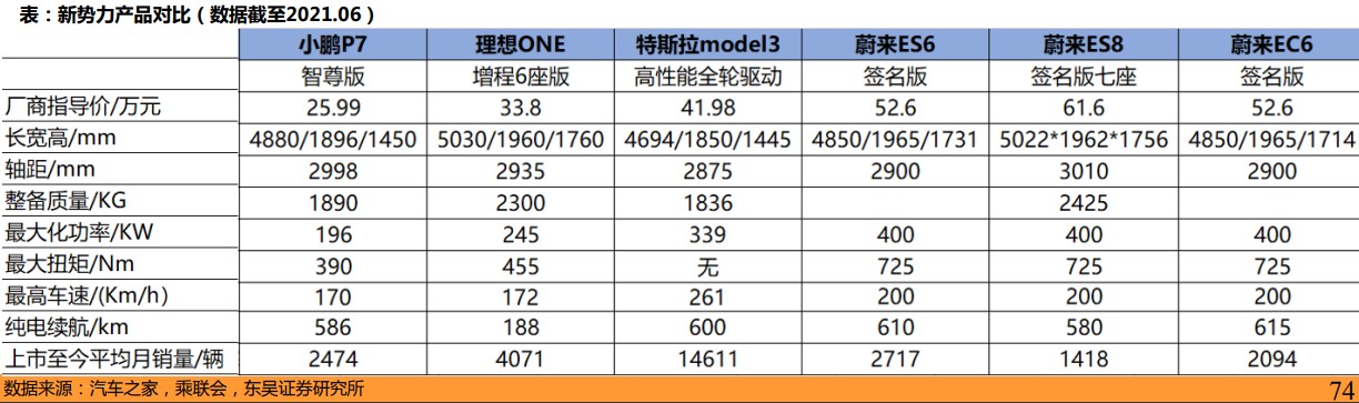 相比之下,蔚來的車型比較多,ES8 定位 45-62 萬元大型豪華 SUV,ES6/EC6 價格繼續下沉定位 36-50 萬元中大型 SUV。隨即進入轎車市場,ET7 定位 45-51 萬元大型豪華轎車,後續 ET5 等轎車市場價格下沉至 30+ 萬元。