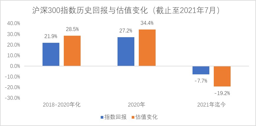 回看今年的市場,此次回調在這之前其實已有預警。從 2015 年股災以後市場逐漸形成了買白馬股的共識,投資者的過度抱團導致了市場行情的分化。這種分化在疫情催化下於 2020 年下半年表現的更為極端。如果拆解股價變化的兩個因素,盈利的成長和估值的變化,我們發現市場情緒導致的估值的擴張遠超過了大市,而實際的盈利因為疫情是負增長。