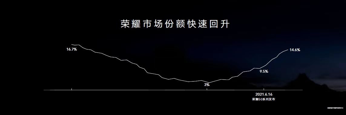 “在截至2021 年 7 月底的 3 個月內,由於榮耀 50 手機保持着高銷量,使得榮耀的市場佔有率從歷史最低點的3%,躍升至 14.6%,榮耀手機周銷份額已重回國內前三。” 趙明在發佈會上表示。