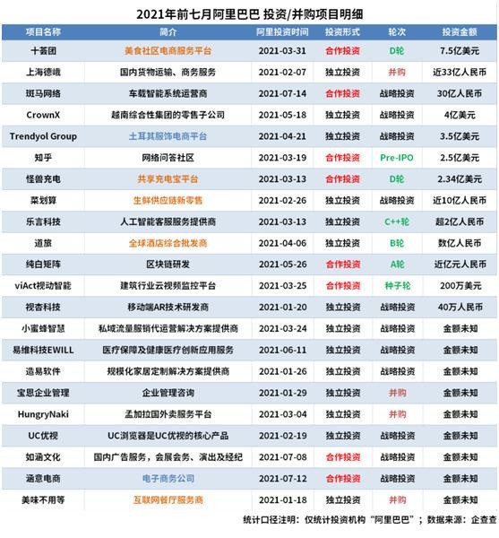 一、今年 1-7 月阿里巴巴對外投資 22 家公司,總披露金額達 208 億元