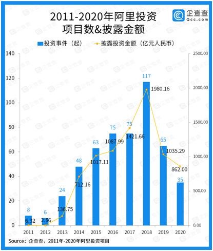 此前,企查查數據研究院推出《2011-2020 年阿里巴巴投資數據報告》,數據顯示,近十來,阿里系對外投資事件共 516 起,總投資金額達 8262.3 億元人民幣。其中,2018 年是阿里投資的高峰期,全年公開參與投資事件達 117 起,披露投資金額約 1980.16 億。2019 年投資熱度有所下降,投資事件驟減至 65 起,總金額也降至 1035.29 億。2020 年,阿里系資本參與投資事件僅 35 起,披露投資金額為 862 億元,可見受新冠疫情等大環境影響,資本也更加慎重。