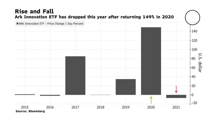 Ark Innovation ETF 在 2020 年回報率為 149% 後,今年出現了下跌