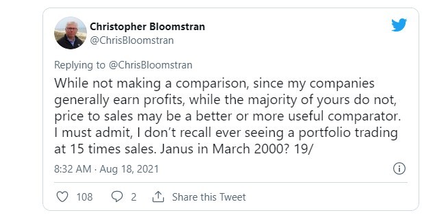 Semper Augustus Investments Group LLC 的首席投資長克里斯·布盧姆斯特蘭 (Chris Bloomstran) 在 Twitter 上發表了他對伍德的 Ark Innovation ETF 及其空頭頭寸的看法。在他的一些帖子中,他向 Wood 解釋了估值和回報率的細微差別。Bloomstran 在推特上寫道,這隻 ETF 的前 10 支股票中有 6 支正在賺錢,而 “壞消息是,市盈率比我習慣看到的要高一些。”“我的結論是,伍德的團隊必須依靠很高增長來獲益。