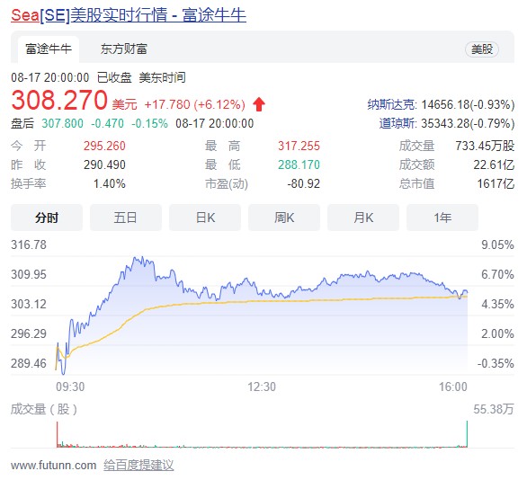 隨後,Sea 以股價的小幅低開迎接了其剛剛公佈的二季報。但隨後在盤中,其股價觸及歷史新高,為 317.26 美元。