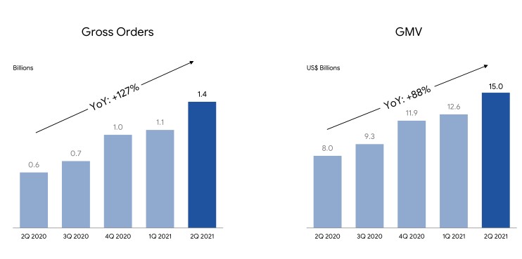 Q2,Shopee 的訂單總量達到 14 億美元,同比增長 127%;總成交額(GMV)達到 150 億美元,同比增長 88%,且從數據來看,過去幾個季度,這兩個數據均處於逐季提升之中。
