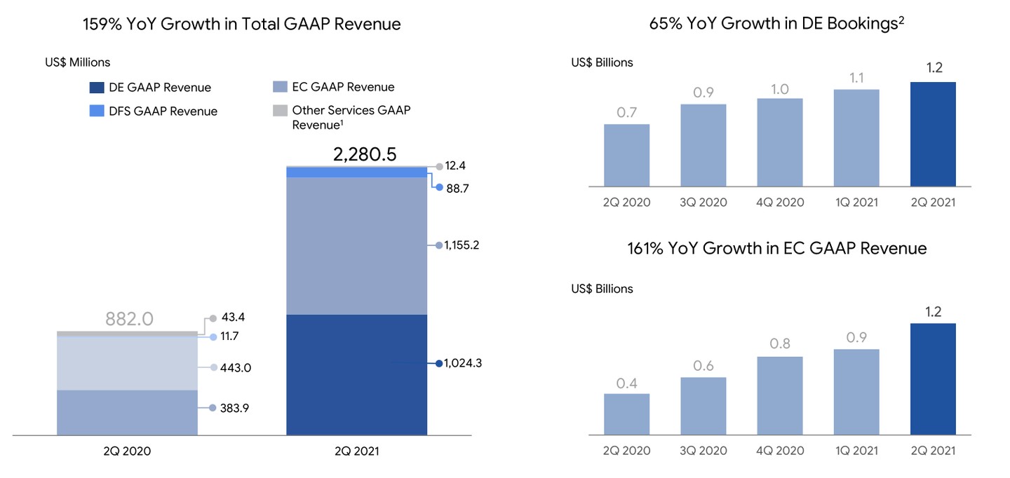 (1)2021Q2,Sea 實現營業收入 22.8 億美元,相比去年同期增長 159%,超出市場預期,最主要的驅動因素來自於電子商務業務(EC);