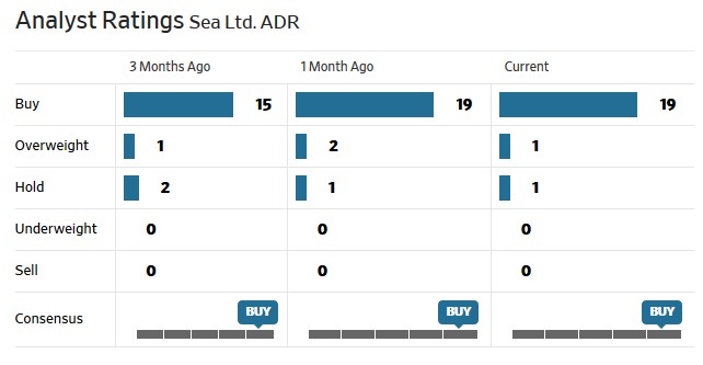 從目前機構評級來看,雖然 Sea 的 PS(市銷率)高達 22 倍以上,在互聯網公司中也處於高位,但大部分分析師給予的都是 “買入” 評級。