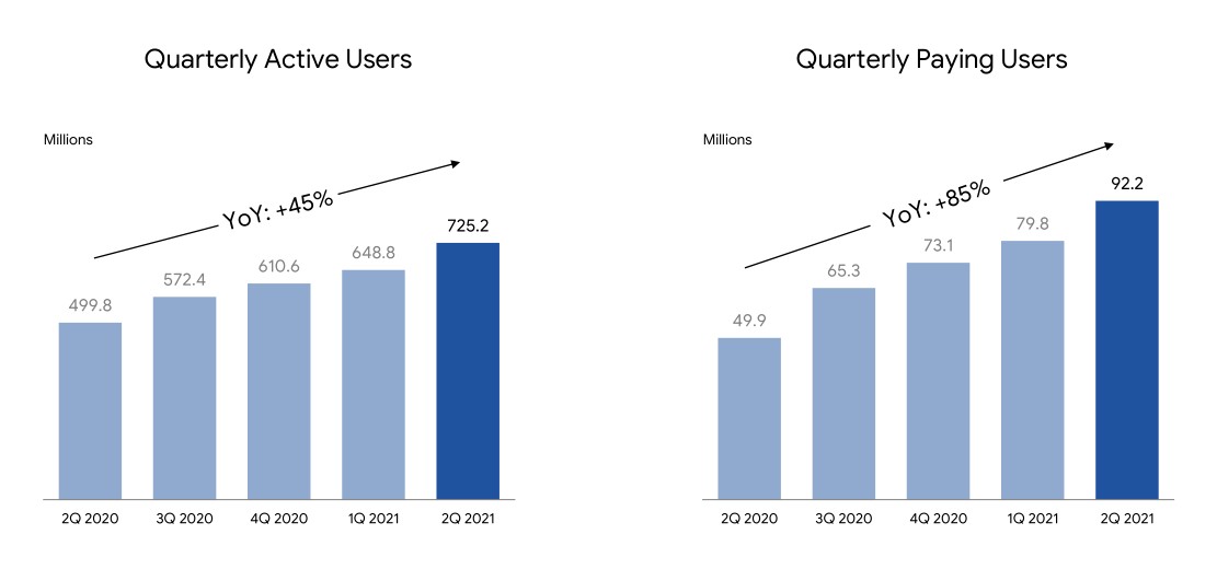 從用户角度,季度活躍用户數為 7.25 億人,相比去年增長 45%,季度付費用户更是增長 85% 達到 9200 萬人。因此,2021Q2 的付費率已經達到 12.7%,相比去年 10% 提升了 2.7 個百分點。
