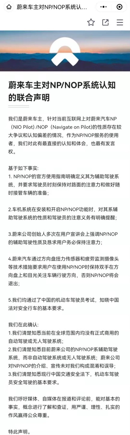 8 月 18 日,一份由 500 人簽署的 “蔚來車主聯合聲明”,聲稱自己知悉 NOP 和自動駕駛的區別,蔚來宣傳沒有誤導自己。