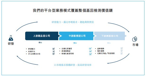 上游部分是由公司內部研發團隊,以及和第三方合作開發的創新技術。主要專注於開發實驗室自建檢測 (LDT) 服務和體外診斷產品 (IVD)。共有 89 項關於消費級基因檢測,以及癌症篩查的商業化檢測,涵蓋了不同的價格範圍,其中的 78 項為自主研發的檢測服務。