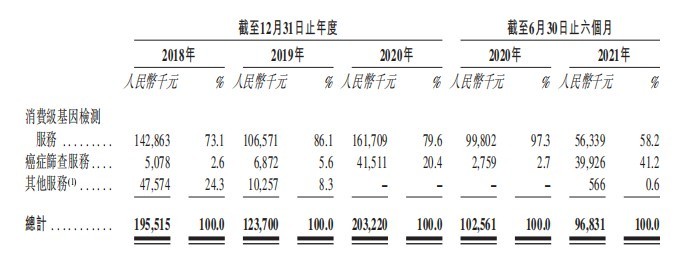 業績方面,美因基因的收入主要來自於消費級基因檢測服務以及癌症篩查服務。其中消費級基因檢測服務的收入,在 2018 至 2020 三年中波動較大,於 2019 年出現減少。今年上半年也同比下滑。