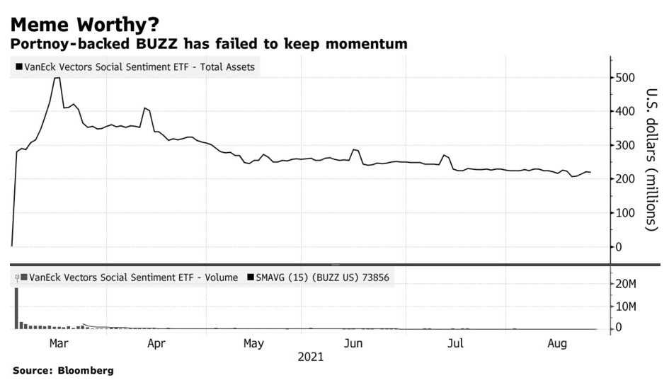 今年年初時,用於衡量 “散户抱團股” 的 VanEck Vectors Social Sentiment ETF(BUZZ.US) 在 Barstool Sports Inc.創始人 Dave Portnoy 的支持下推出,上市時便迅速匯聚了約 5 億美元的資產,但其目前資產規模已跌落至約 2.2 億美元。
